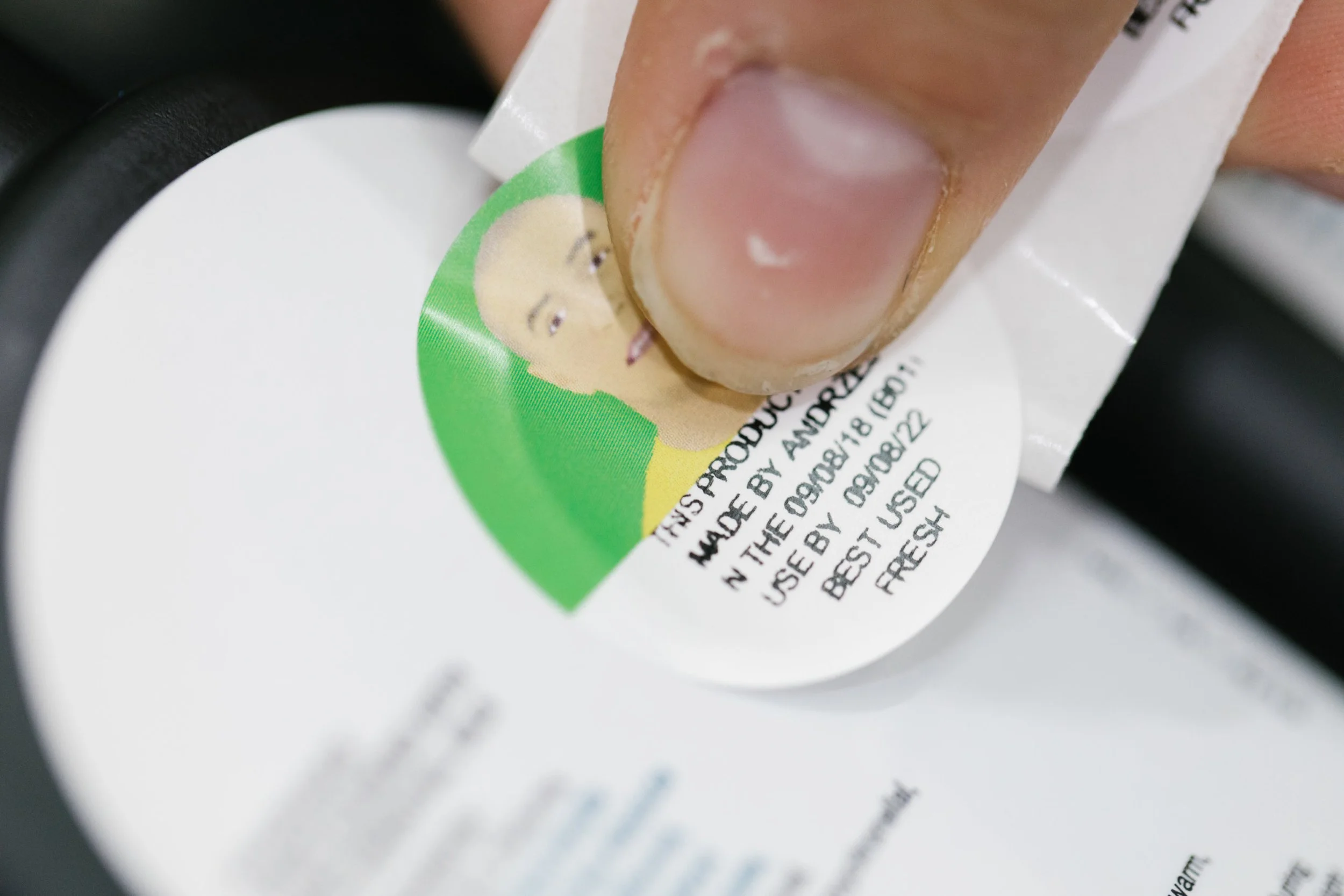Lush’s products are “made by hand, fresh, every day…”. To back up this claim, their products feature a sticker with a cartoon face, the name of the person who made that specific batch, and the date it was made.
