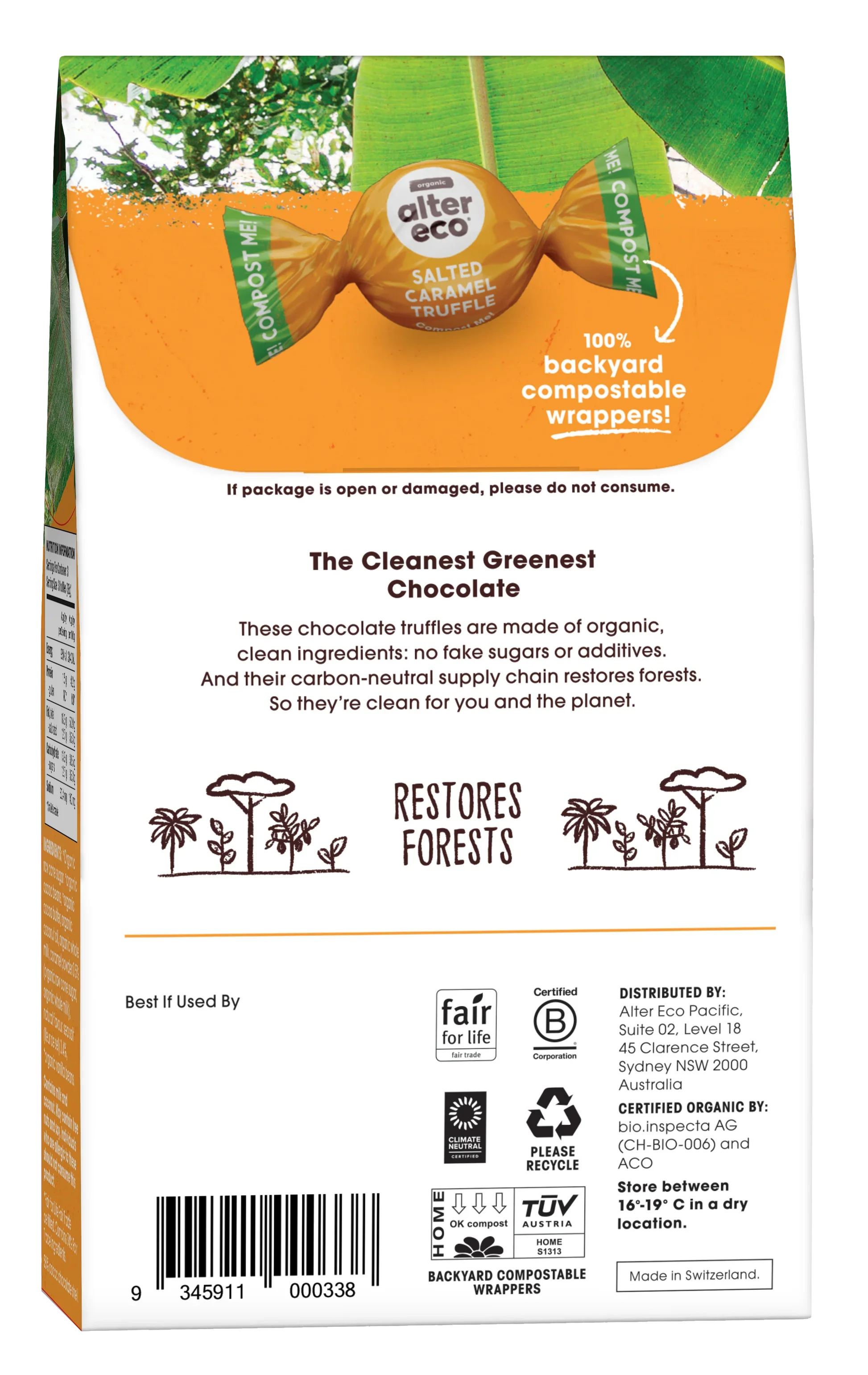 Alter Eco features key certifications like Fair Trade and Organic, and include a bold icon stating "100% backyard compostable wrappers!" This turns the packaging itself into tangible proof of their circular mission.